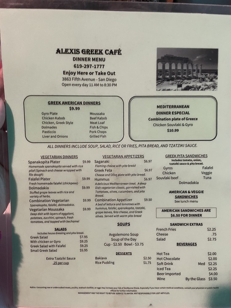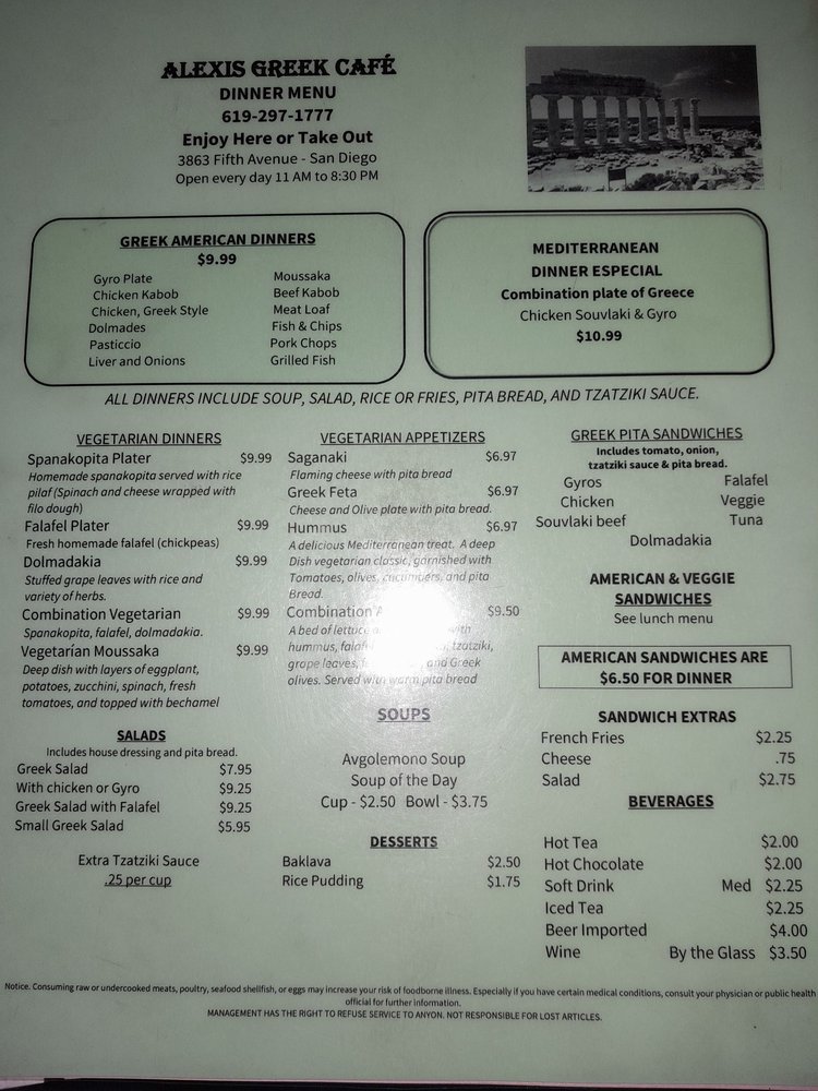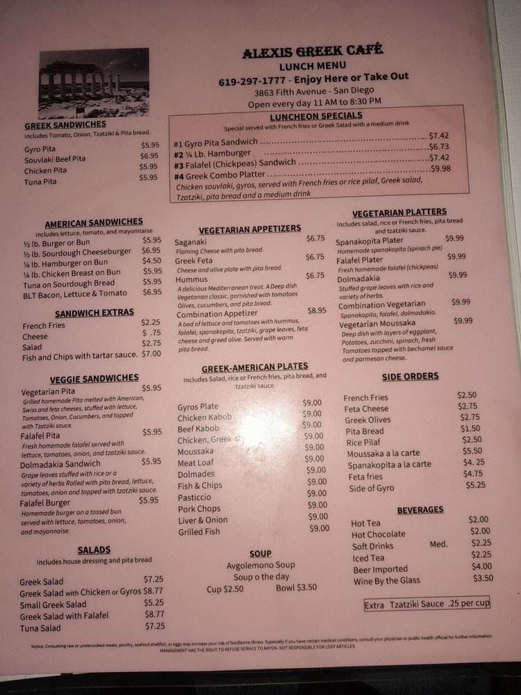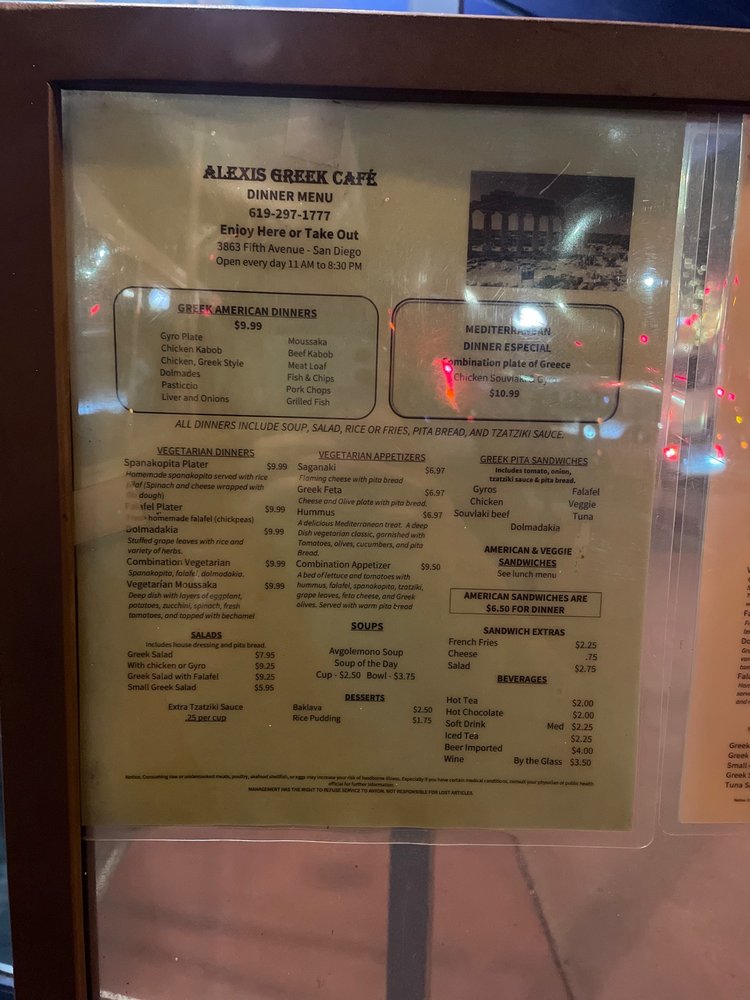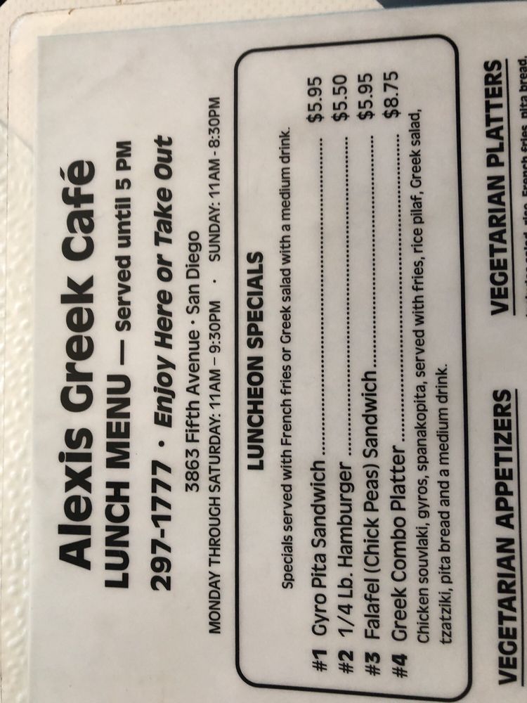 Alexi's Greek Cafe, located at 3863 Fifth Ave in San Diego, offers a delightful Greek-Mediterranean dining experience. With a focus on fresh, fast food and genuine, family-style service, this casual cafe is perfect for groups and families. The menu boasts many vegetarian options, including favorites like the Spanakopita platter and Falafel platter, which come with generous portions at affordable prices. Customers rave about the flavorful dishes, such as the vegetarian Moussaka and Gyro plate lunch special. Despite its simple ambiance, Alexi's Greek Cafe shines through its delicious food and excellent value. Whether you're looking for a quick lunch or a satisfying dinner, this hidden gem in Hillcrest is worth a visit for a taste of authentic Greek cuisine.