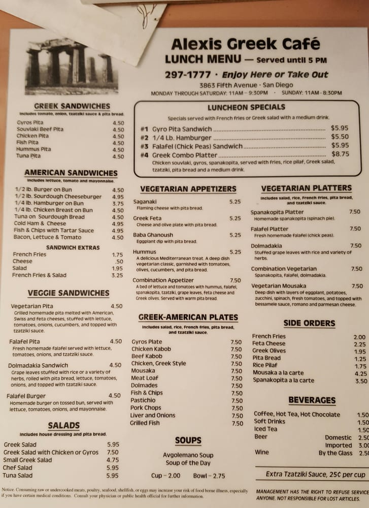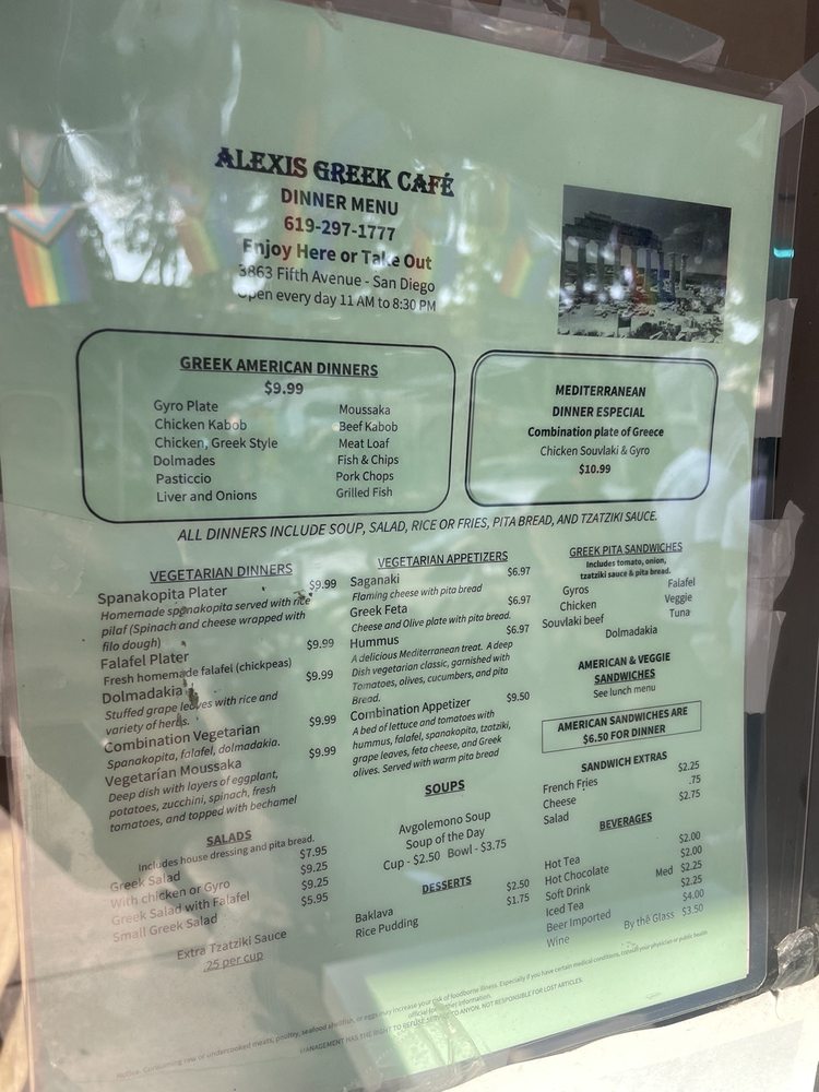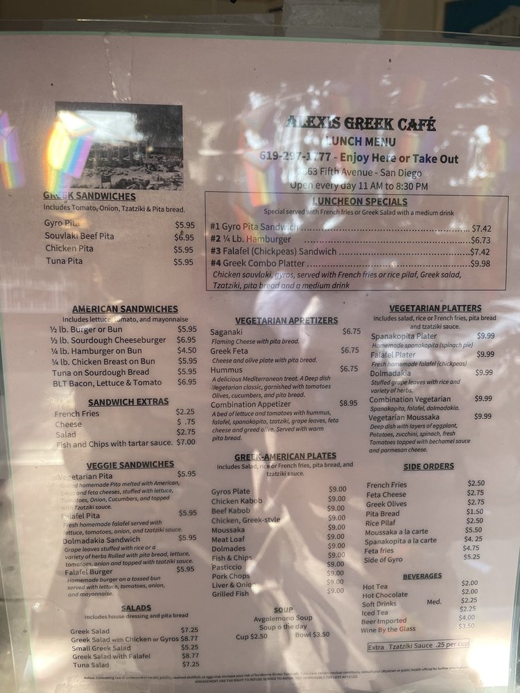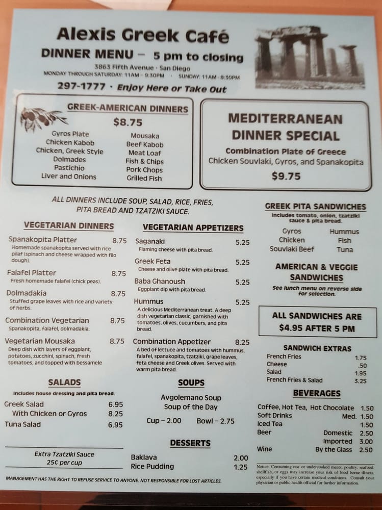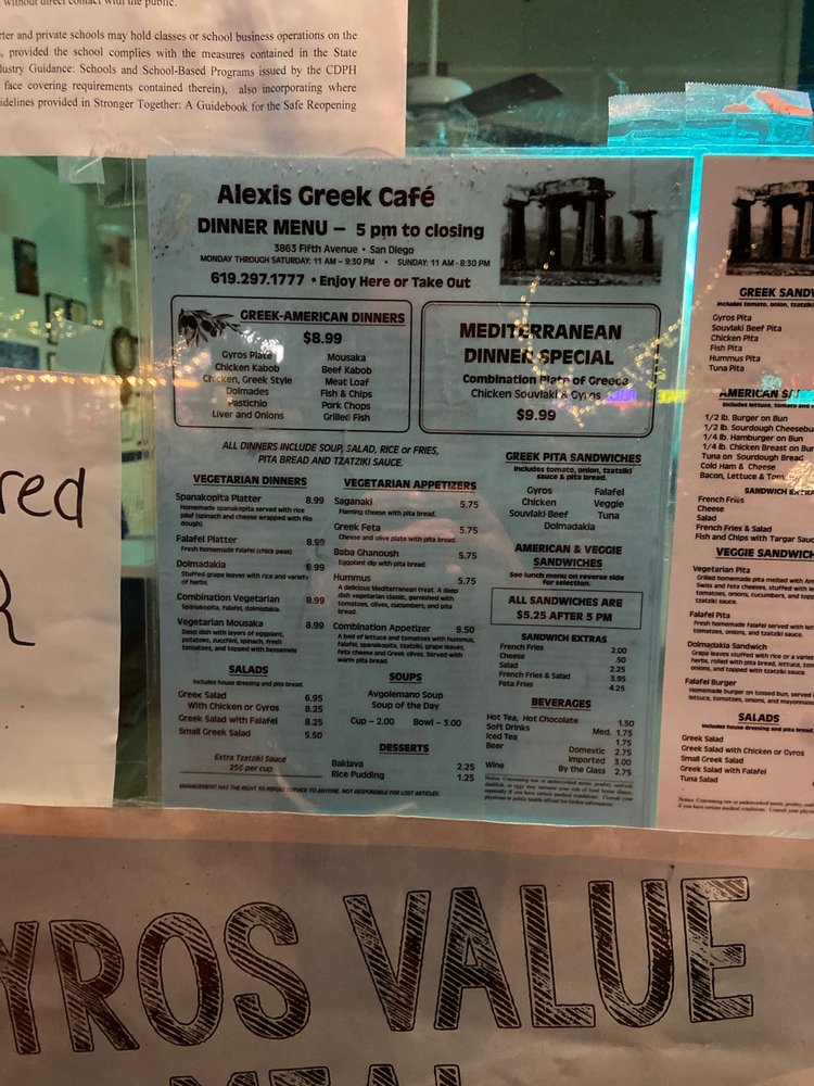 Alexi's Greek Cafe, located at 3863 Fifth Ave in San Diego, offers a delightful Greek-Mediterranean dining experience. With a focus on fresh, fast food and genuine, family-style service, this casual cafe is perfect for groups and families. The menu boasts many vegetarian options, including favorites like the Spanakopita platter and Falafel platter, which come with generous portions at affordable prices. Customers rave about the flavorful dishes, such as the vegetarian Moussaka and Gyro plate lunch special. Despite its simple ambiance, Alexi's Greek Cafe shines through its delicious food and excellent value. Whether you're looking for a quick lunch or a satisfying dinner, this hidden gem in Hillcrest is worth a visit for a taste of authentic Greek cuisine.